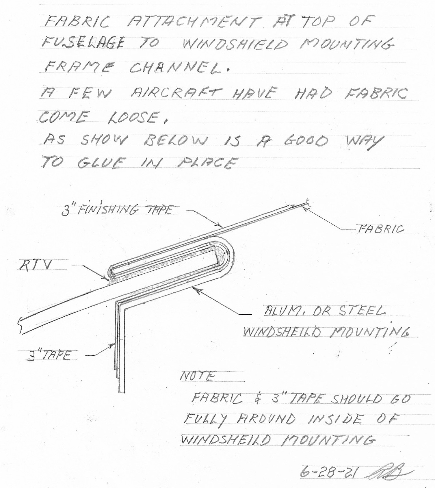 Fabric attachment at top of fuselage to windshield mounting frame channel. A few aircraft have had fabric come loose. As shown above is a good way to glue in place. Note: Fabric and 3" tape should go fully around inside of windshield mounting.