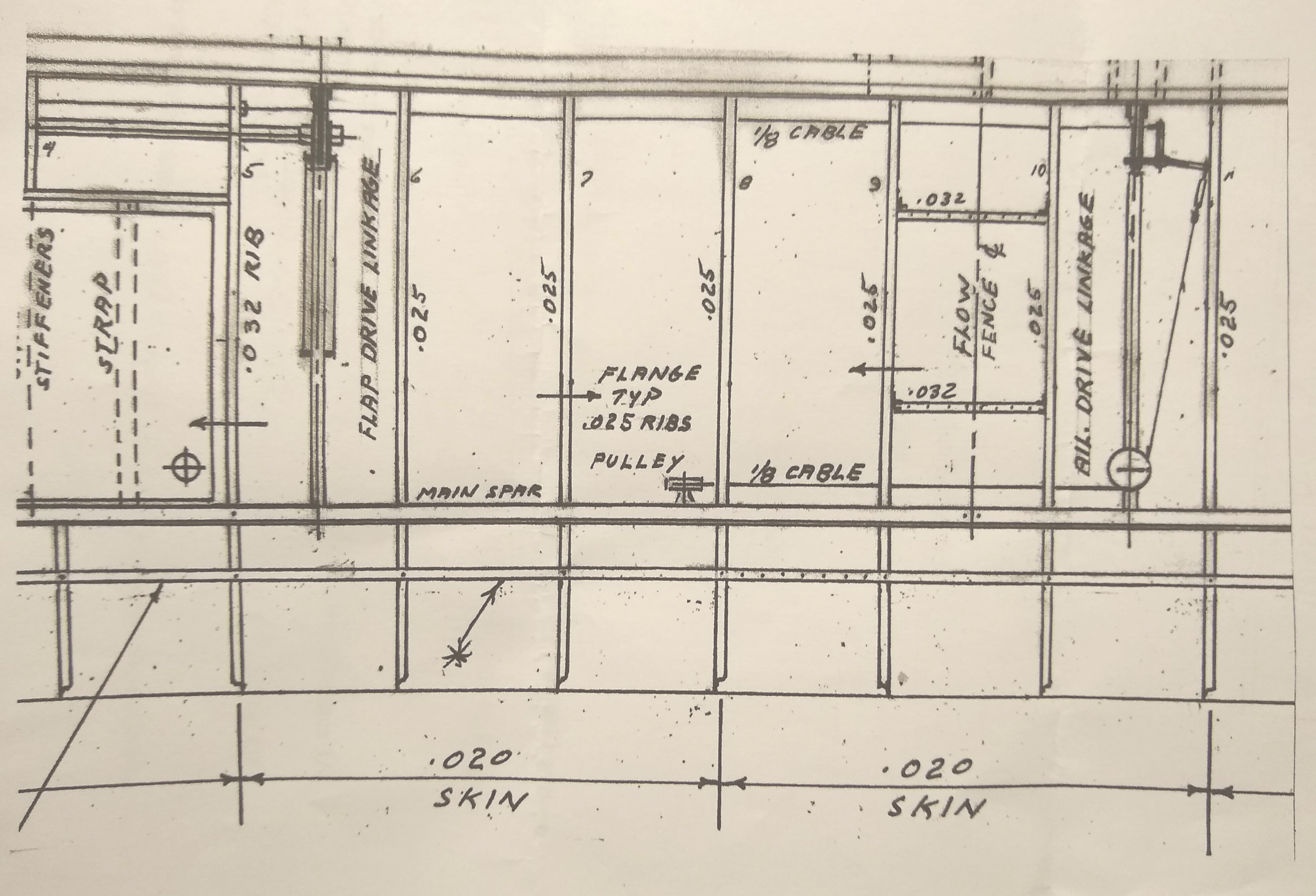 Due to skin deflection in flight (oil canning), a skin stiffener channel has been added 4 inches in front of the main spar web laying on top of the nose ribs. The stiffener is .020 2024-T3 Aluminum, 3/4 inch wide with 5/16 inch flanges.
