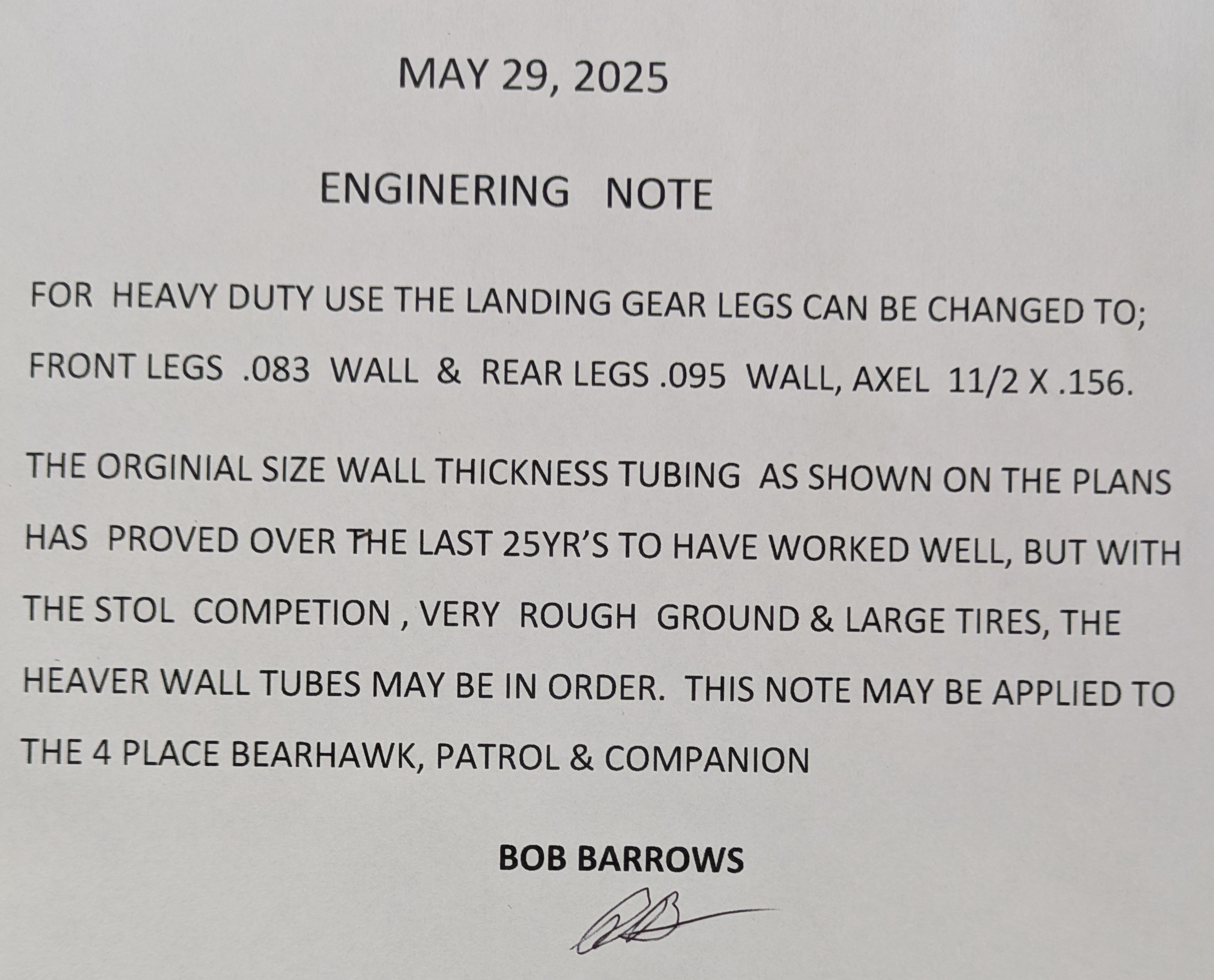The original size wall thickness tubing as shown on the plans has proved over the last 25 years to have worked well, but with the STOL competition, very rough ground and large tires, the heavier wall tubes may be in order. This note may be applied to the 4-Place Bearhawk, Patrol, and Companion.